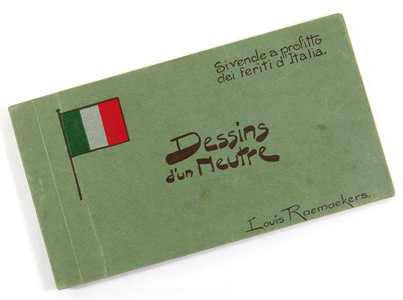 EPHEMERAPrima edizione.Buon esemplare, con le cartoline ben conservate (le prime e ultime due distaccate).Rara tiratura in italiano (uscì anche in francese): «Si vende a profitto dei feriti d’Italia». Immagini che rimandano alle atrocità commesse dai tedeschi durante la prima guerra mondiale; l’autore era un artista e fumettista olandese, noto per la sua cifra anti-teutonica.