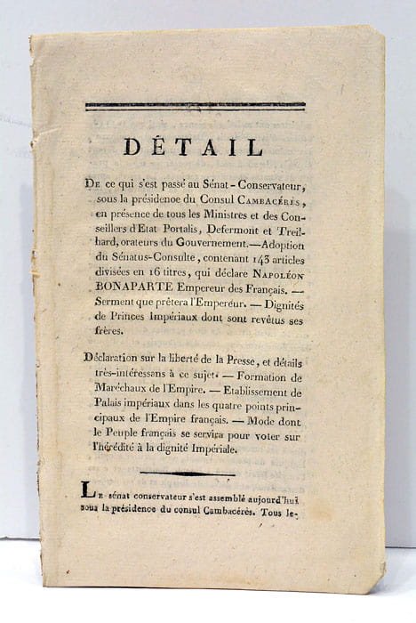 DETAIL de ce qui s'est passé au Sénat-Conservateur, sous la présidence du Consul Cambacérès, en présence de tous les Ministres et des Conseillers d'Etat Portalis, Defermont et Treilhard, orateurs du Gouvernement. Adoption du Sénatus-Consulte, contenant 143 articles divisées en 16 titres, qui déclare Napoléon Bonaparte Empereur des français. Serment que prêtera l'Empereur. Dignités des Princes Impériaux dont son revêtus ses frères. Déclaration sur la liberté de la Presse, et détails très-intéressants à ce sujet. Formation de Maréchaux de l'Empire. Etablissement de Palais impériaux dans les quatre points principaux de l'Empire français. Mode dont le Peuple français se servira pour voter sur l'hérédité à la fignité Impériale.