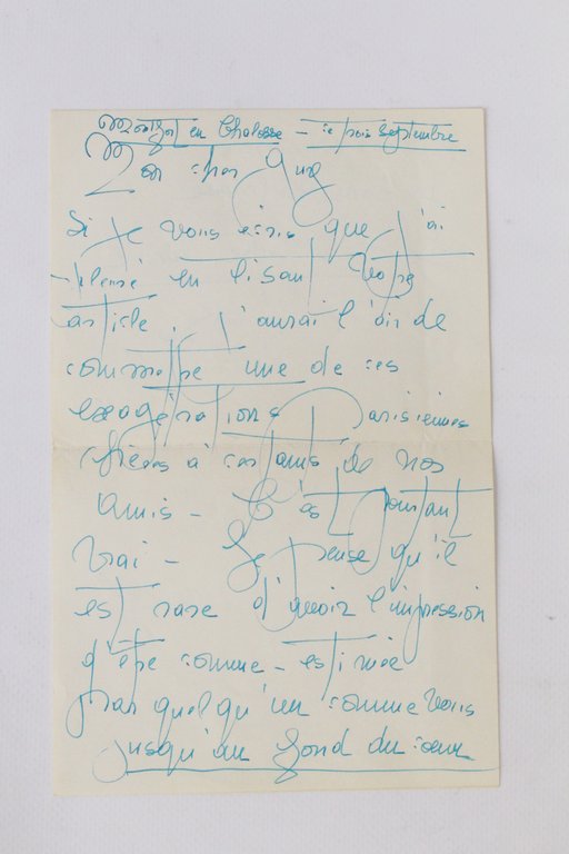 1963 et s. d. | 15 x 10.50 cm | une carte et un feuillet remplié | [ENGLISH DESCRIPTION ON DEMAND] | Lettres autographes signées de Lise Deharme adressées à Guy Dupré, 9 lignes au stylo rouge sur une carte postale et 17 lignes à l'encre bleue sur deux pages sur un feuillet remplié. Pliure inhérente à la mise sous pli. Ensemble témoignant de l'amitié unissant Lise Deharme, figure du surréalisme, et Guy Dupré, alors éditeur chez Plon : « Si je vous écris que j'ai pleuré en lisant votre article, j'aurais l'air de commettre une de ces exagérations parisiennes chères à ces amis de nos amis »