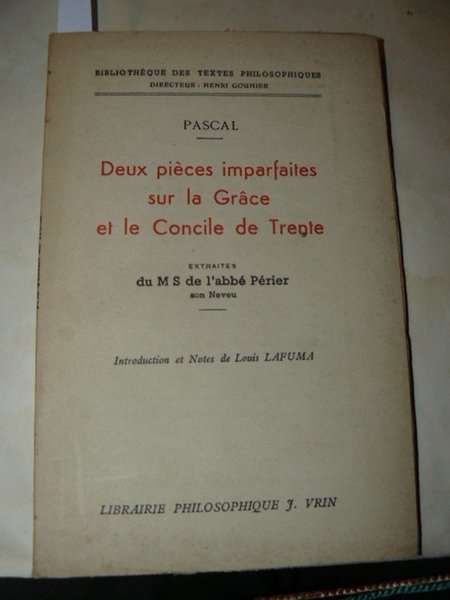 Deux Pieces Imparfaites Sur La Grace Et Le Concile De Trente. Extraites du l'abbé Perier son Neveu. Introduction et notes de Louis Lafuma