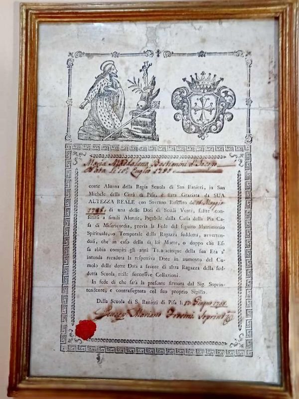 Attestato di cm. 23x33, San Ranieri e Blasone cittadino incisi in xilografia , Attestato riempito in parte calligrafico, firmato Giuseppe Mariano Frosini Sovrintenedente e timbro a ceralacca. Montato in cornice dorata. Si notano abrasioni al margine bianco superiore e sinistro.