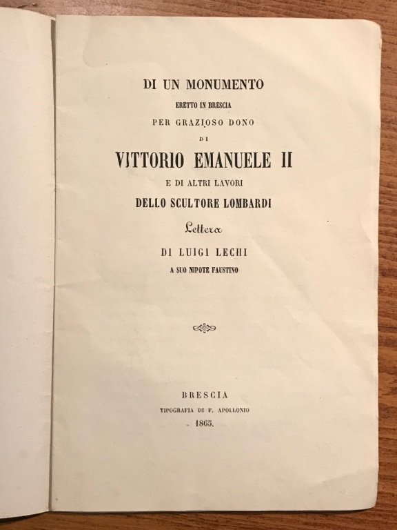 Di un monumento eretto in Brescia per grazioso dono di Vittorio Emanuele II e di altri lavori dello scultore Lombardi. Lettera [.] a suo nipote Faustino.