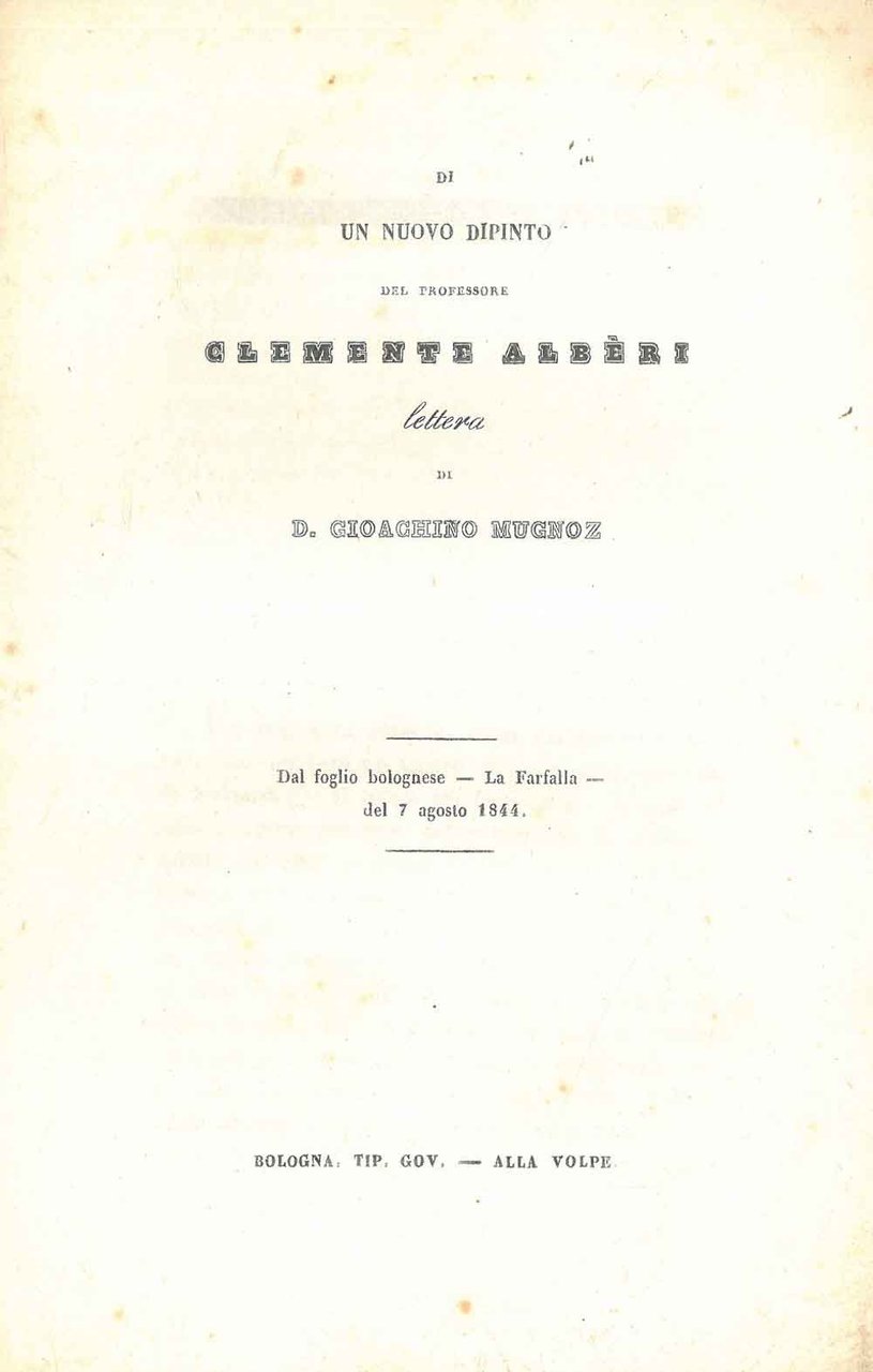 20 cm, bross. muta coeva; pp. 8. Estratto dal foglio bolognese La Farfalla del 7 agosto 1844