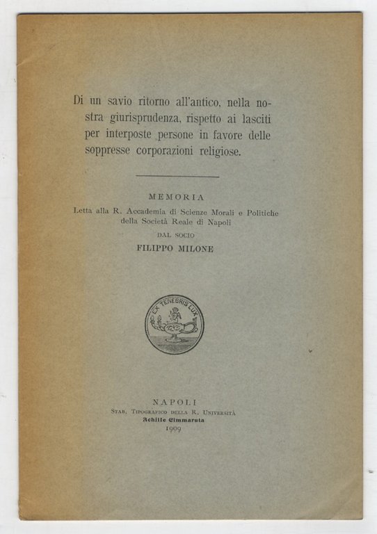 Di un savio ritorno all'antico, nella nostra giurisprudenza, rispetto ai lasciti per interposte persone in favore delle soppresse corporazioni religiose. Memoria.
