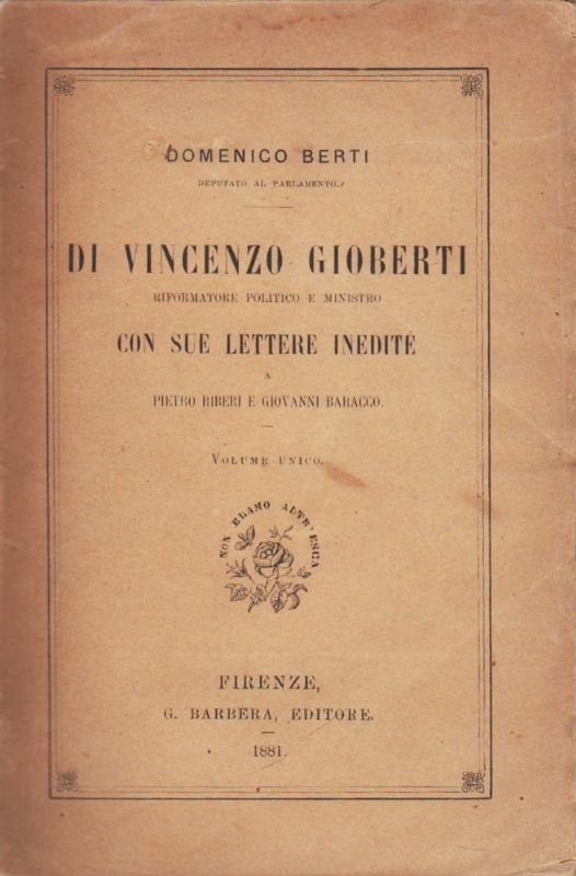 In-8°, legatura moderna in mezza pergamena con tit. su tassello al dorso, conservata la brossura editoriale; pp. XCI(1)-260(4) (una di errata e tre bb.). In numeri arabi le pagine con gli inediti di Gioberti. Ex-libris moderno al verso del piatto anteriore della brossura; buon esemplare. Non comune.