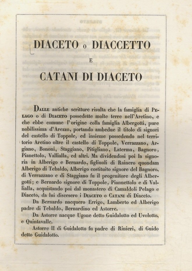 Lodi, Wilmant e figli, 1841-1848, in-4, privo di brossura, pp. [14]. Con uno stemma accuratamente miniato a mano all'epoca, su una tavola f.t. Fascicolo a fogli sciolti, dedicato alla storia della famiglia, tratto da "Teatro araldico, ovvero Raccolta generale delle armi ed insegne gentilizie delle più illustri e nobili casate che esisterono un tempo e che tuttora fioriscono in tutta Italia" di Leone Tettoni e F. Saladini, Lodi, Wilmant e figli, 1841-1848. Buone condizioni.