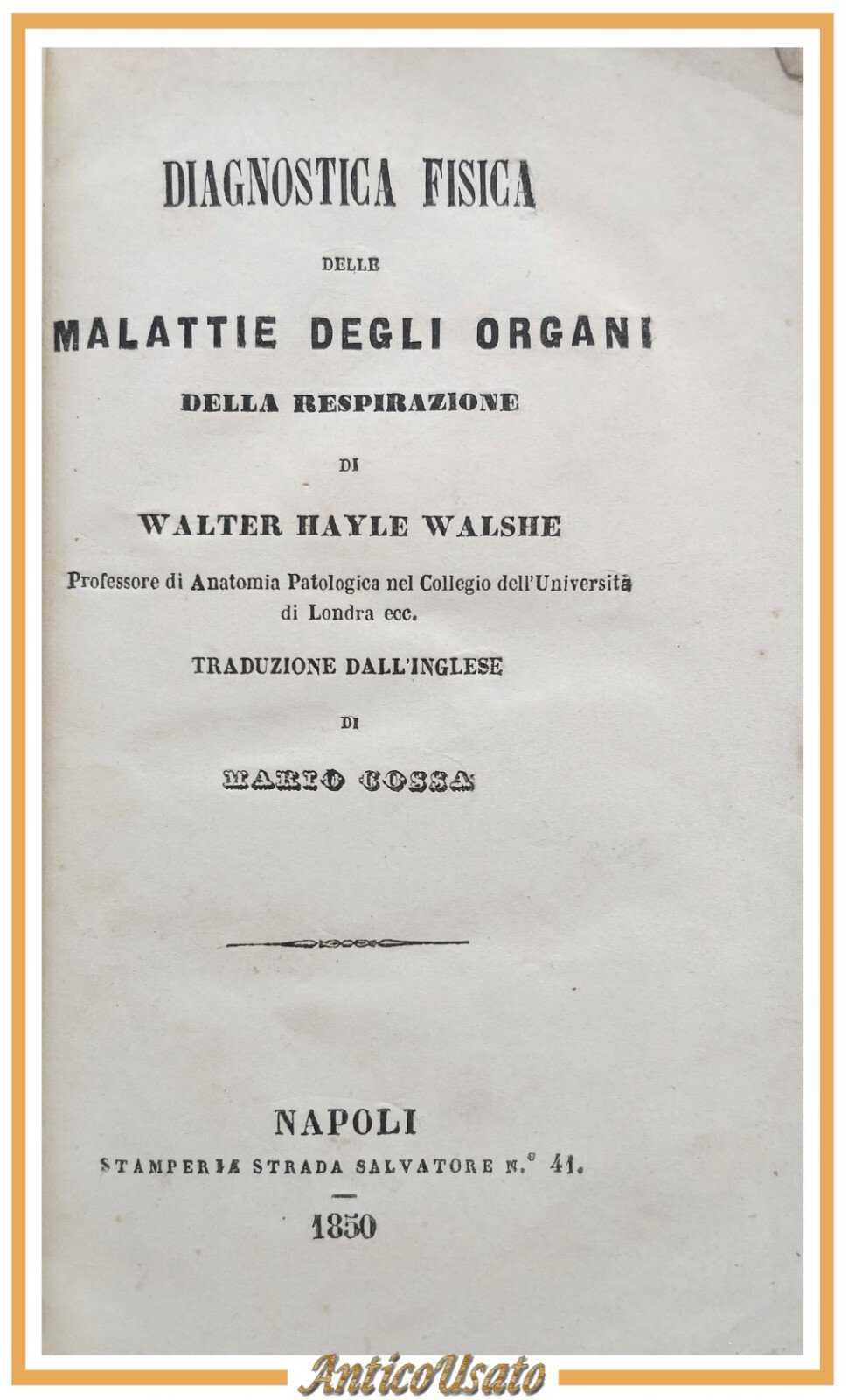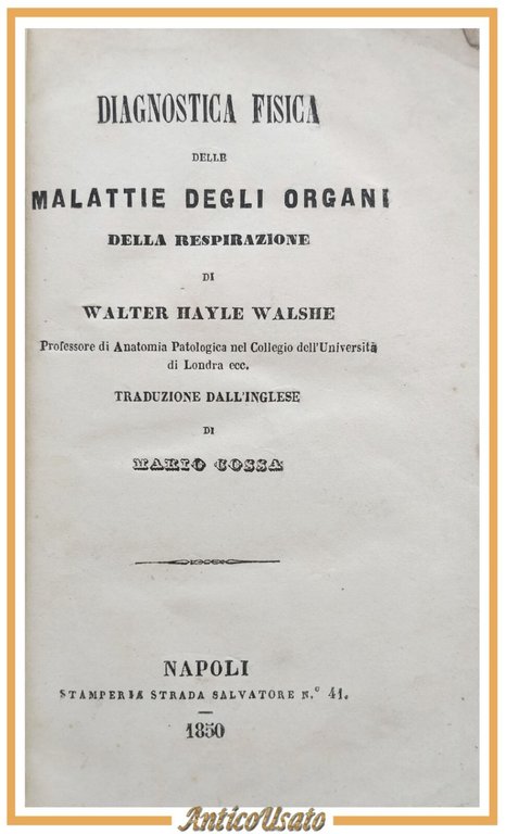 Napoli, Stamperia strada Salvatore 41, 1850. 298 pagine. Copertina non editoriale in carta. Dimensioni: 19 x 12 cm. Stato di conservazione: molto buono (pagine ingiallite, fioriture) Libro antico medicina polmoni pneumologia saggistica