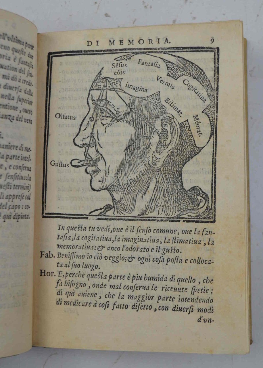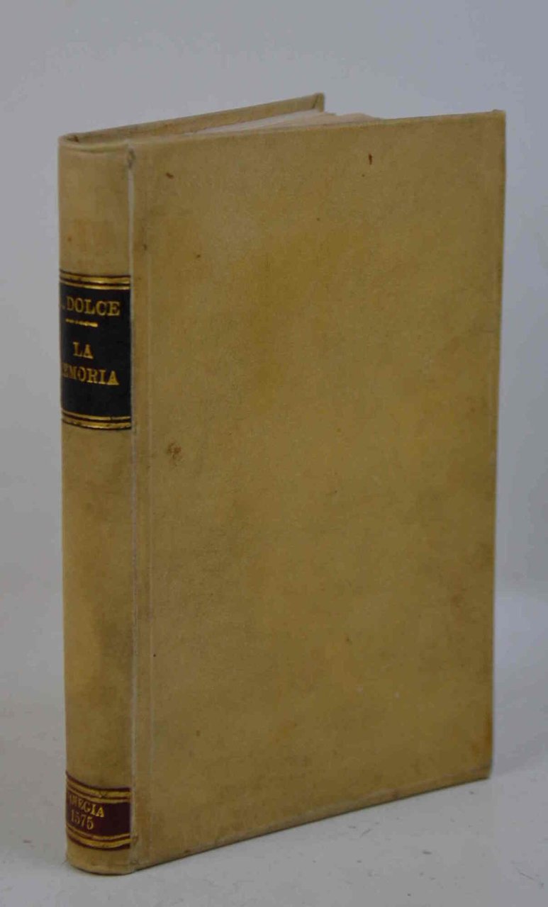 Cm, 14,5, cc. 118 (2) di cui l'ultima con il colophon. Grande marchio tipografico al frontespizio (gatto con il topo in bocca) e molte figure incise nel testo (perlopiù a piena pagina). Legatura ottocentesca in piena pergamena rigida con titoli in oro su tasselli al dorso. Esemplare molto ben conservato, senza difetti. Le xilografie, di notevole elaborazione formale, raffigurano vari alfabeti (uno di essi si basa su quello che si trova nell'opera di Jacobus Publicius "Oratoris Artis Epitomata", impressa a Venezia nel 1482), una testa umana con la posizione delle facoltà mentali, una città, l'albero "Hortus Philosophiae", una figura femminile simulante la "Gramatica", ecc. Si tratta di uno dei principali trattati mnemotecnici del Rinascimento italiano. Il Dolce traspone, in una forma dialogica latamente ispirata al De Oratore di Cicerone, i principi di ars memorativa contenuti nel Congestorium artificiosae memoriae (1520) del domenicano tedesco Johannes Romberch, trattato di cui il presente libro riprende anche numerose xilografie. Il Dolce, che dichiara espressamente tale debito, senza apportare innovazioni capitali alla mnemotecnica compie tuttavia un interessante sforzo di adattare le tecniche del Romberch alla cultura italiana, per esempio utilizzando, quali guide mnemoniche, Dante e le figure mitologiche presenti nella pittura di Tiziano.