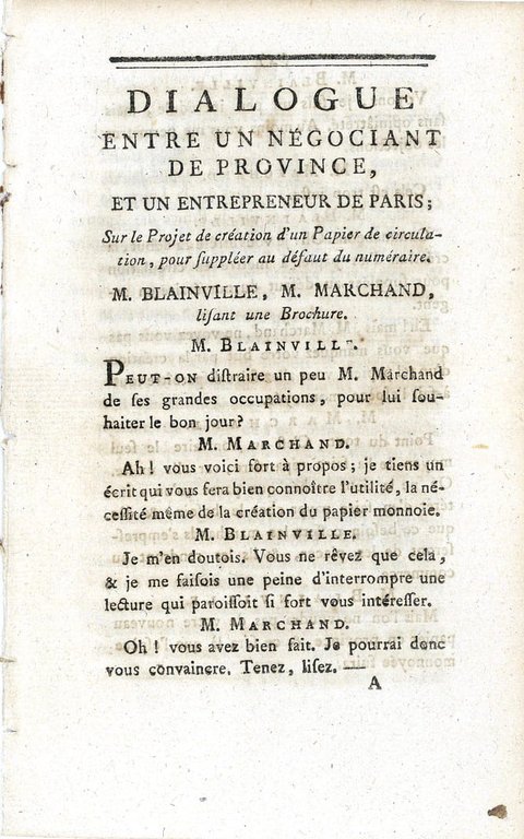 DIALOGUE entre un négociant de province et un entrepreneur de Paris; sur le Projet de création d'un Papier de circulation, pour suppléer au défaut du numéraire.