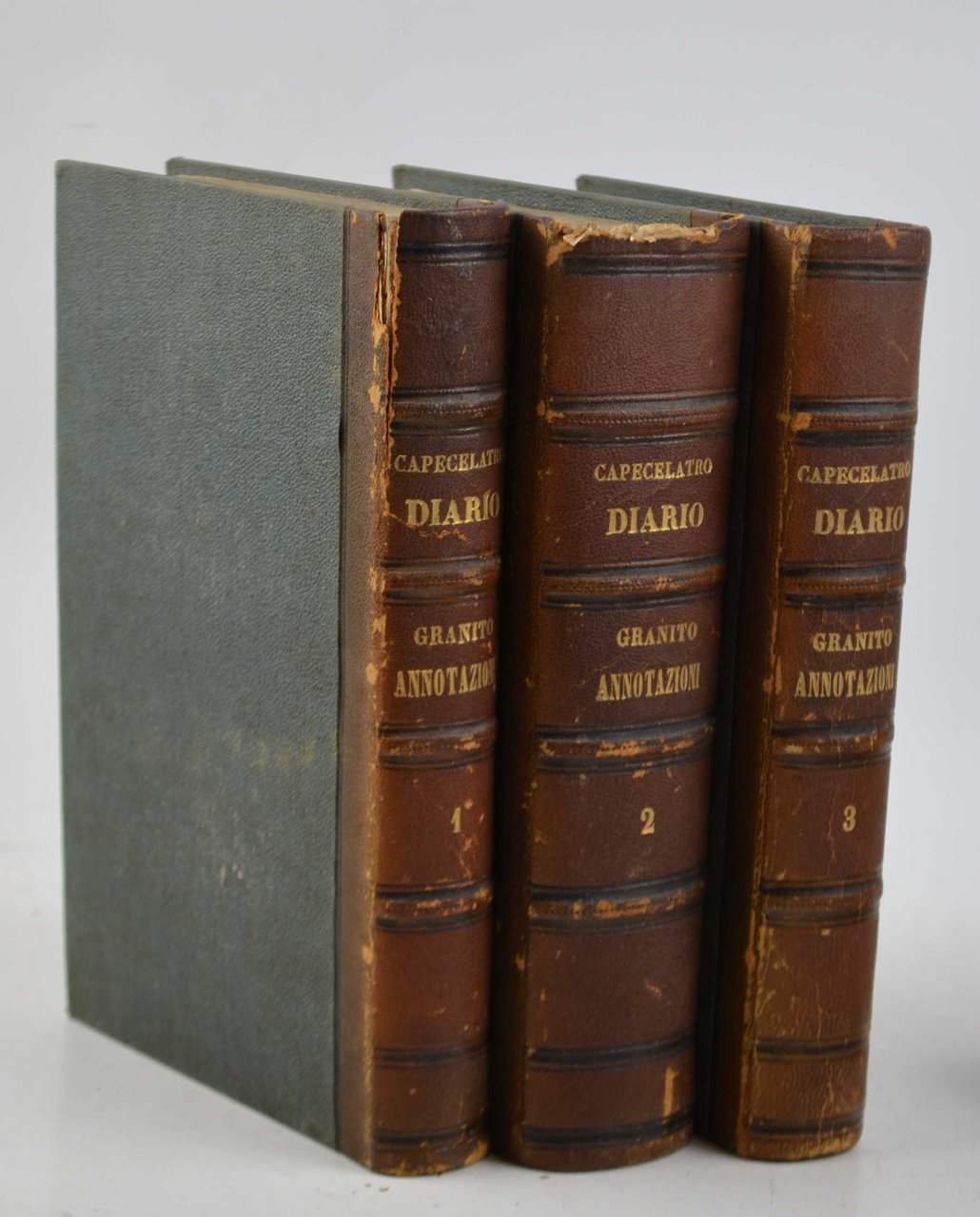 Tre volumi di cm. 22, pp. xv (1) 266, 144 (2); (4) 607 (1), 523 (3); viii, 536, 207 (1). Legatura coeva in mezza pelle, dorsi a nervi con titoli in oro. Ex libris nobiliari incisi. Qualche segno d'usura alle cerniere ed alla parte alta di una cerniera, peraltro esemplare genuino e ben conservato, con poche fioriture. Edizione originale di questa celebre cronaca storica rimasta inedita per due secoli.