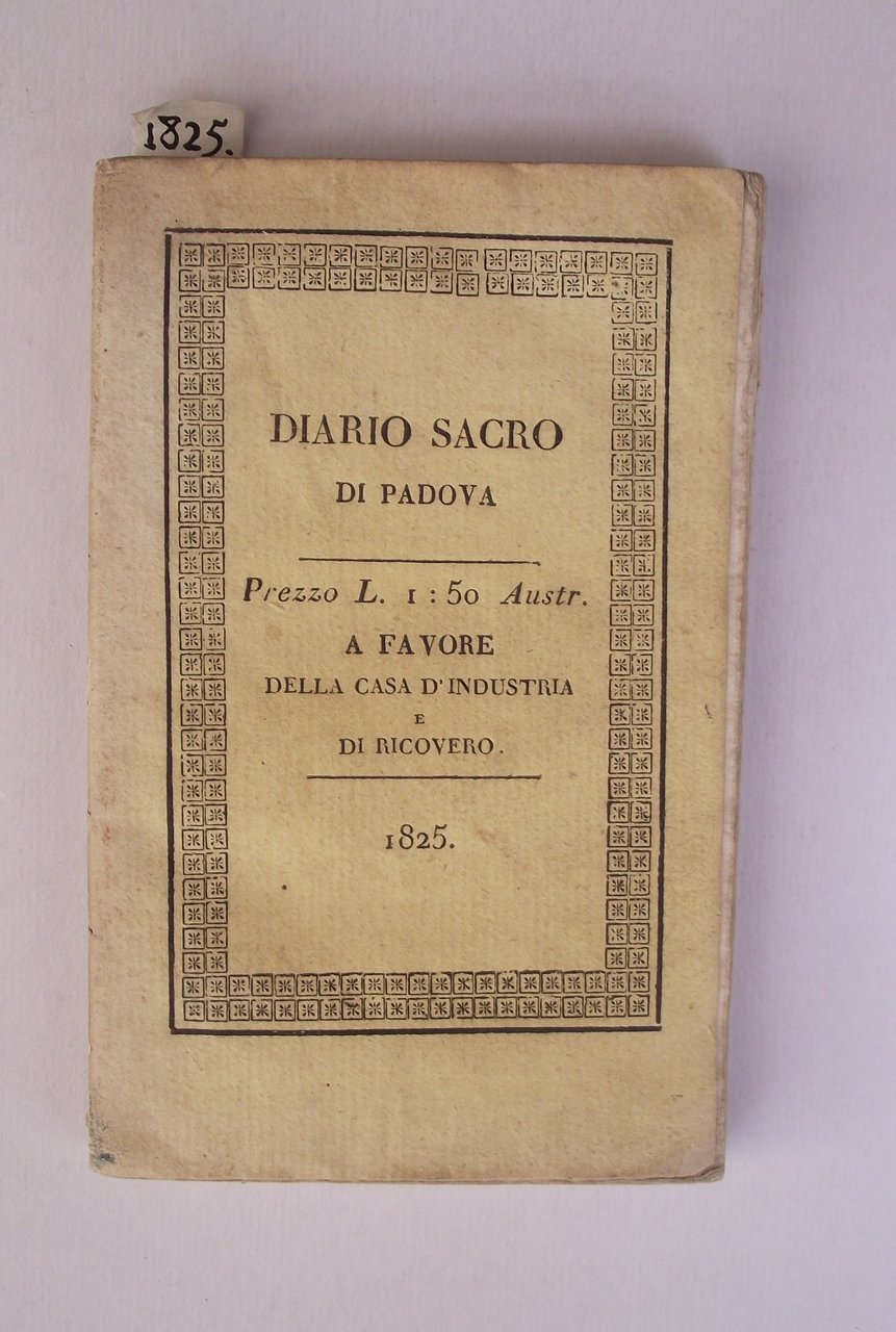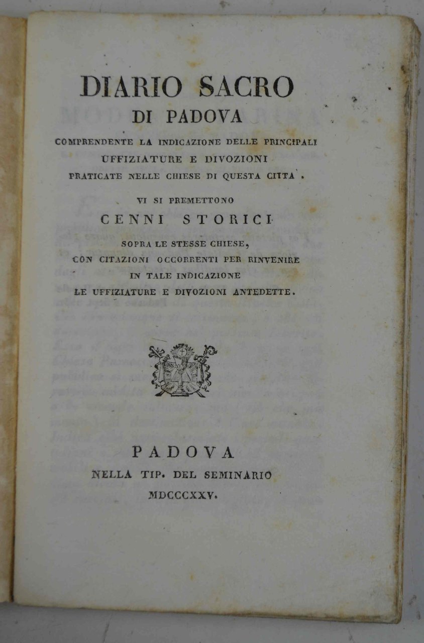 Diario sacro di Padova comprendente la indicazione delle principali Uffiziature e Divozioni praticate nelle chiese di questa città. Vi si premettono cenni storici sopra le stesse chiese, con citazioni occorrenti per rinvenire in tale indicazione le Uffiziature e Divozioni suddette.