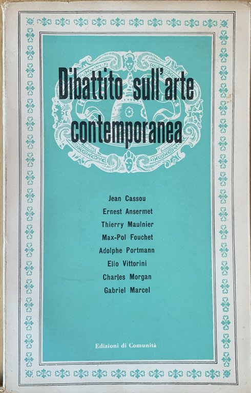 I ed. italiana: marzo 1954 (I ed.: "Débat sur l'art contemporain", Neuchâtel-CH, Éditions de la Baconnière). Traduzione di Franco Salvatorelli. "I saggi qui presentati sono stati letti alle "Rencontres" di Ginevra nel settembre 1948" (dalla Nota di p. 7). VIII, 244, brossura con risvolti e con grafica in bianco/nero/verde. Stato buono (copertina lievemente brunita - pagine brunite, in partticolare ai margini - timbro blu omaggio a p. 244). Indice: Nota - Jean Cassou: La situazione dell'arte contemporanea - Ernest Ansermet: L'esperienza musicale e il mondo d'oggi - Thierry Maulnier: La situazione dell'arte contemporanea - Max-PolFouchet: Significato dell'arte contemporanea - Adolphe Portmann: L'arte nella vita dell'uomo - Elio Vittorini: L'artiste doit-il s'engager? - Charles Morgan: L'indipendenza degli scrittori - Gabriel Marcel: Le condizioni di un rinnovamento artistico.