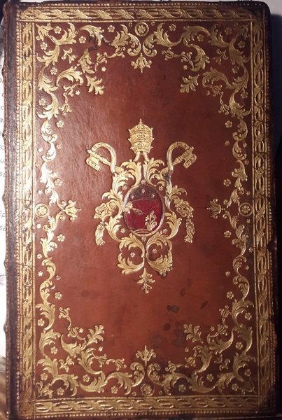 In-8°, 64pp, stampate su carta azzurrina, testo francese a fronte, fastosa legatura in piena pelle coeva alle armi di papa Pio VI Braschi su entrambi i piatti con fregi e cornice in oro, titolo su tassello al dorso in oro, nervature e fregi al dorso, tagli in oro.In-8 °, 64pp, printed on light blue paper, French text on the front, sumptuous binding in full coeval calf, coat of arms of Pope Pius VI Braschi on both sides with friezes and gilt frame, gilt title on the spine, bands and friezes on the spine, gold edges.