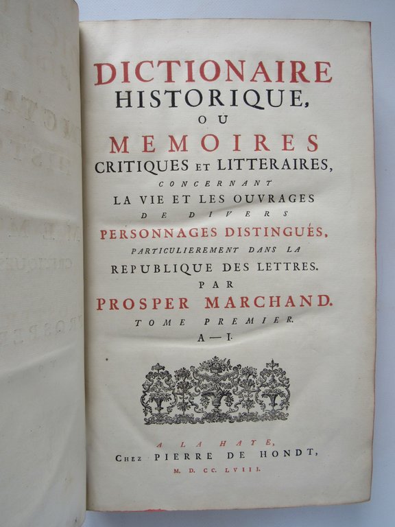 Chez Pierre De Hondt | à La Haye [The Hague] 1758 - 1759 | 25.50 x 41 cm | 2 tomes en un volume relié | [ENGLISH DESCRIPTION ON DEMAND] | Edition originale qui ne connaîtra pas de réimpression. Elle est illustrée d'une planche, d'un tableau généalogique de la famille Estienne, et 7 figures in-texte (médailles.). Page de titre en rouge et noir. Impression sur deux colonnes, le faux-titre et les titres sur papier fort. 6 pages de catalogue à la fin du tome I. Reliure en plein veau brun marbré et glacé d'époque. Dos à nerfs orné. Pièce de titre en maroquin rouge. Coiffes arrachées ; Mors supérieur fendu, mors inférieur fendu en grande partie, et même ouvert en queue et tête. Manque de cuir sur un nerf ; coins dénudés et émoussés ; frottements et épidermures). Papier frais dans l'ensemble. Libraire éditeur, littérateur et biographe, Prosper Marchand a conçu ce dictionnaire comme une suite ou un supplément au dictionnaire de Bayle. L'auteur le laissa en manuscrit et c'est son ami et exécuteur testamentaire, Lallemand qui mit 4 années à organiser les notes et parfaire l'édition. Pour chaque personnage du dictionnaire, on trouve une biographie, une critique des ses oeuvres, une bibliographie et des anecdotes. L'ouvrage est rempli d'informations rares et intéressantes sur des écrivains ou lettrés oubliés de toutes les époques, notamment du Moyen âge.