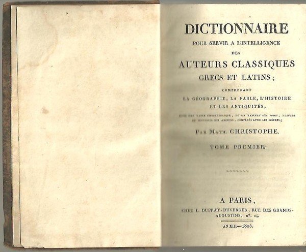 DICTIONNAIRE POUR SERVIR A L'INTELLIGENCE DES AUTEURS CLASSIQUES GRECS ET LATINS, COMPRENANT LA GEOGRAPHIE, LA FABLE, L'HISTOIRE ET LES ANTIQUITES.
