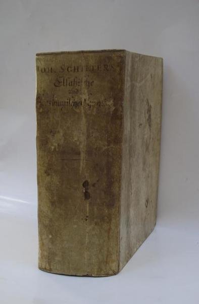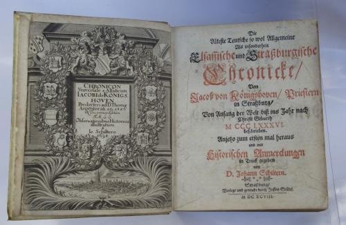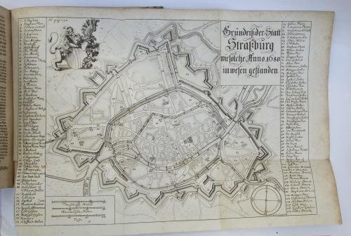 Due parti in un volume di cm. 20,5, pp. xxiii, 1172 (142); 52 (2). Con bell'antiporta allegorica che include una piccola veduta della città, primo frontespizio in rosso e nero, alcune figure incise nel testo e 7 tavole (di cui 6 ripiegate). Tra queste è presente la bella pianta della città di Strasburgo. Legatura coeva in piena pergamena rigida con titoli manoscritti al dorso. Esemplare genuino e ben conservato. La seconda parte, che titola: Origines Civitatis Friburgi in Brisgovia. occupa le 52 pagine finali. Edizione originale ed unica di questa bella cronaca che va sino al 1386 e che l'autore ha tratto da un manoscritto. Non comune soprattutto quando completa di tutte le tavole come nel presente esemplare.