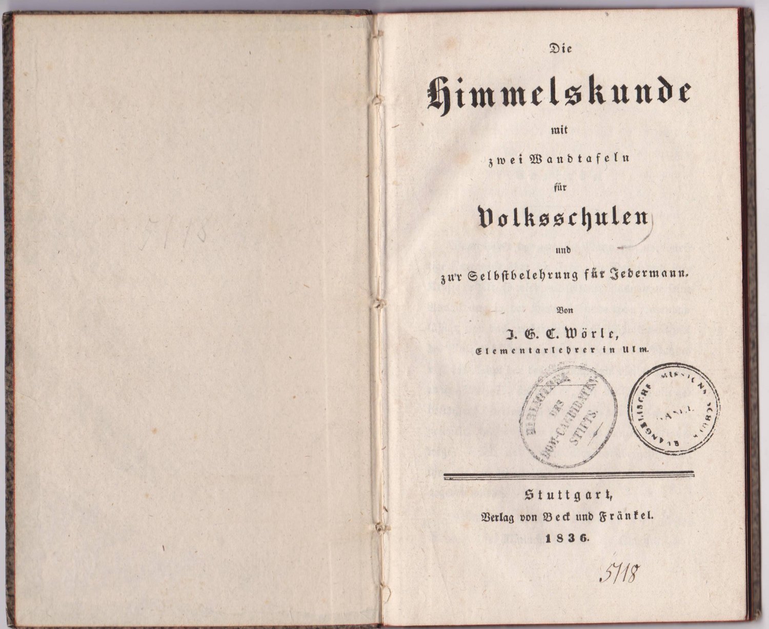- Mit Resten eines Nummernschildchens auf Rücken und vorderem Deckel, Einband leicht berieben. 2 runde Eigentum- Stempel und eine handschriftliche Nummer auf dem Titel , sonst in sehr ordentlichem Zustand. Die "zwei Wandtafeln" sind nicht mit eingebunden!