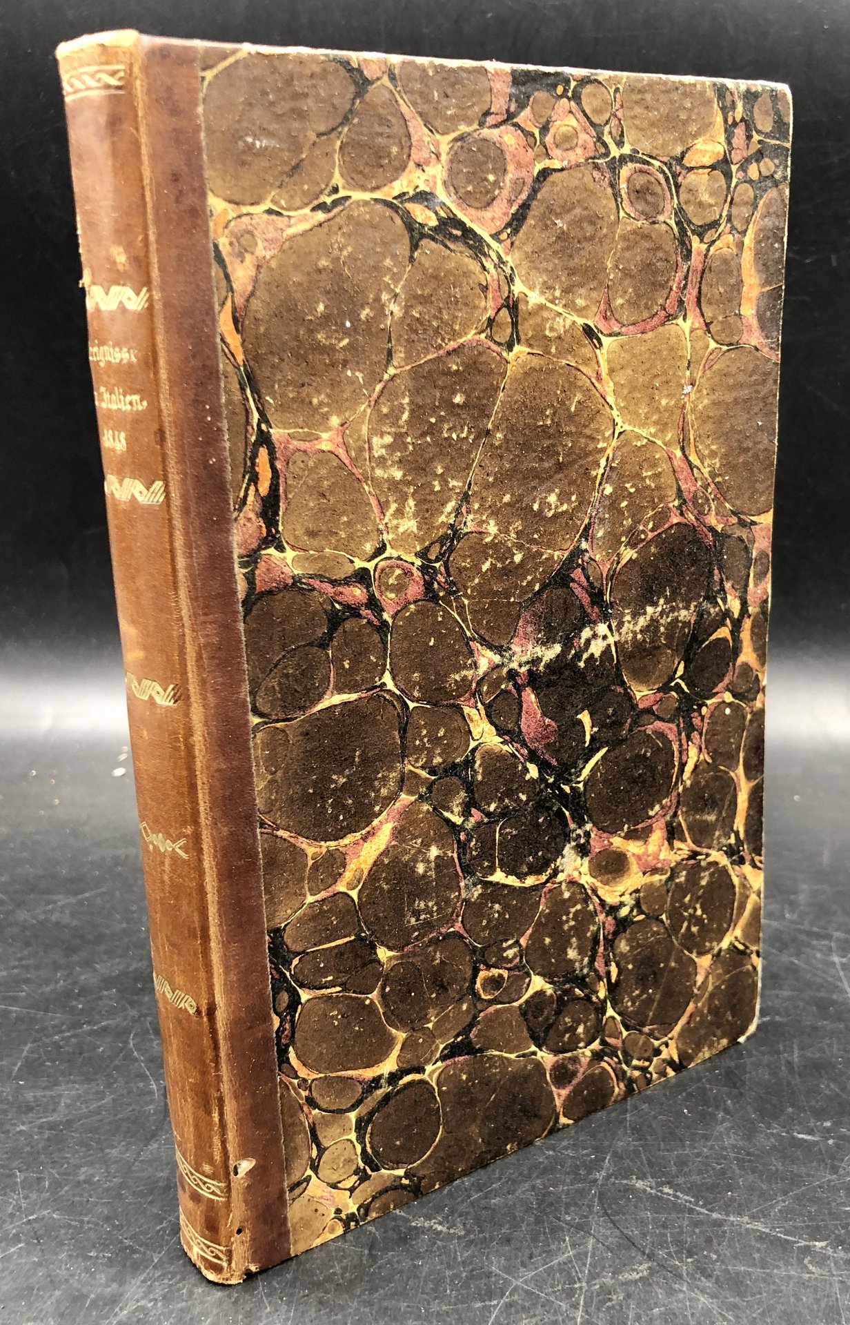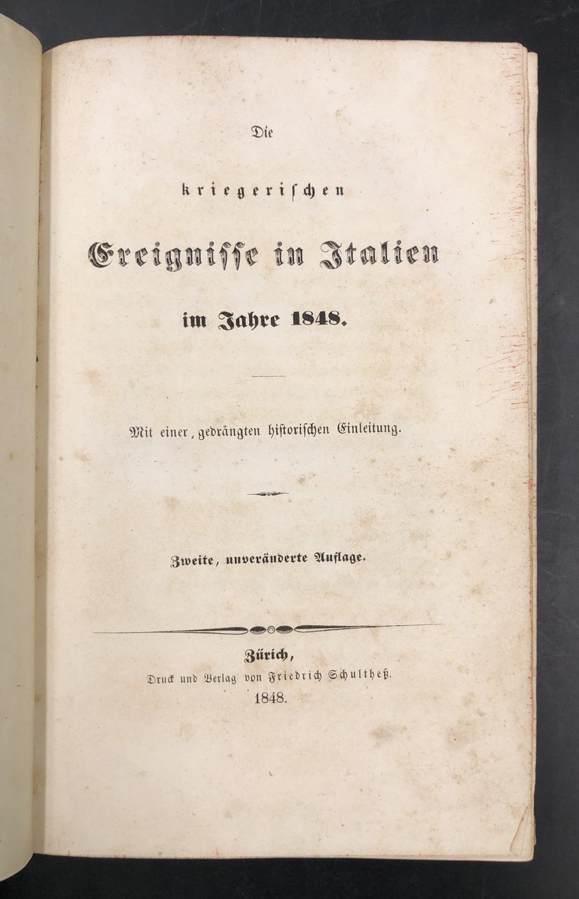 In-8° (cm. 20x13), pp. 348. bella solida mezza pelle coeva, titolo e fregi oro al dorso, carta decorata policroma ben coordinata (minimi graffi) ai piatti, tagli rosa. Firma coeva d'appart. alla sguardia. Resoconto filoaustriaco nel corso degli eventi della Prima Guerra d'Indipendenza, dello scrittore militare MEYER-OTT, Stadtrat di Zurigo, che nella prefazione dichiara di avvalersi di Atti uffliciali dei Comandi delle due controparti, su verificabili comunicazioni private di attendibili testimoni oculari, e sulla sua personale conscenza acquisita con osservazioni dirette dei teatri di guerra dei due eserciti ("auf eine sorgfältige Prüfung und Benutzung der öffentlich gewordenen Akten und Berichte der kriegführenden Theile, auf schätzbare Privatmittheilungen zuverlässiger Augenzeugen und einige durch eigene Anschauung erworbene Kenntniß des Kriegsschauplatzes und der beidseitigen Armeen"). A questo volume, in sé completo, seguì una continuazione, che non abbiamo, sul 1849