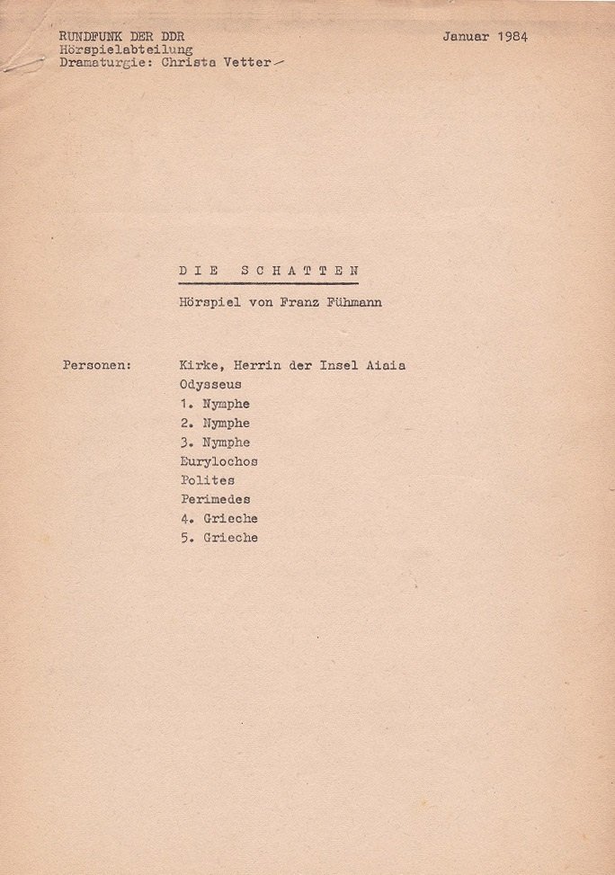 Franz Fühmann hat insbesondere in den späteren Jahren mehrere Hörspiele verfasst. Hier liegt sein Hörspiel "Die Schatten" in einer zeitgenössischen DDR-Rundfunkfassung vor. Das Deckblatt wurde entsprechend gekennzeichnet: Rundfunk der DDR, Hörspielabteilung. Die Fassung ist auf Januar 1984 datiert. Laut dem umfassenden Fühmann-Werkverzeichnis von Uwe Buckedahl wurde das Hörspiel zuerst im Mai 1984 im Berliner Rundfunk gesendet, später dann in anderen Sendern und Programmen mehrfach wiederholt. Die Erstsendung wurde noch zu Lebzeiten Fühmanns gebracht. Wie weit mögliche Anpassungen oder Veränderungen am Text durch Dramaturgie (Christa Vetter) / Regie (Barbara Plensat) gingen kann an dieser Stelle nicht nachvollzogen werden, Buckedahl gibt die Sendezeit mit 01:03:43 an. In der "Neuen Deutschen Literatur" erschien das Hörspiel im November 1984, als Buchausgabe erst 1986. Da die vorliegende Fassung auf Januar 1984 datiert ist, wäre durchaus möglich daß es sich hier um eine Arbeitsfassung in Zusammenarbeit mit dem Autor handelte, bis zur Sendung waren noch 4 Monate Zeit. Die Rundfunkfassung übergab Fühmann kurz vor seinem Tod zusammen mit vielen anderen seiner Papiere einer ihm sehr verbundenen Buchhändlerin in Westberlin. Diese war Mitarbeiterin der für Fühmanns Aktivitäten in Westberlin und der BRD sehr wichtigen Autorenbuchhandlung in Westberlin (Carmerstraße, Berlin-Charlottenburg). Das Typoskript entstammt dem Nachlaß dieser Lieblingsbuchhändlerin Fühmanns. Es ist, falls überhaupt, nur in Archiven verfügbar.