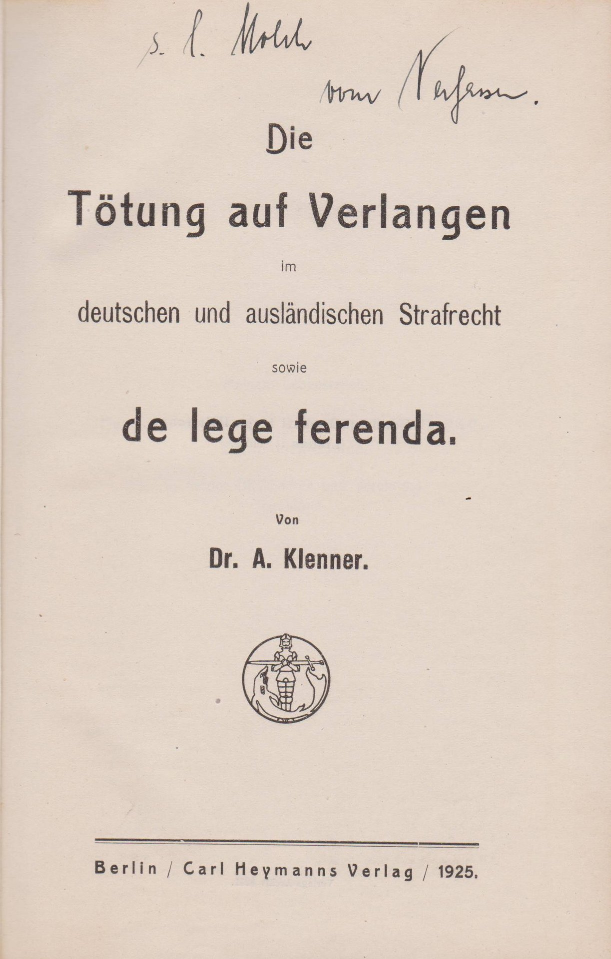 Die Tötung auf Verlangen im deutschen und ausländischen Strafrecht sowie de lege ferenda. (Verfasserwidmung!).
