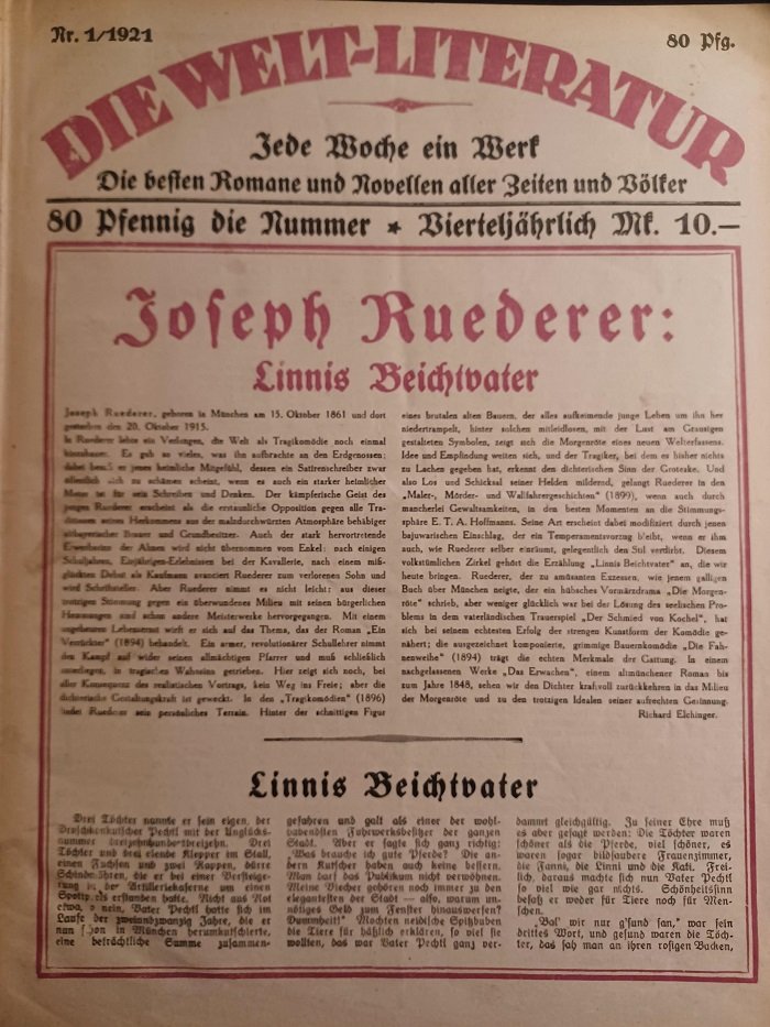 Die Welt- Literatur. Jede Woche ein Werk. Ab Nr.14: Halbmonatlich ein Werk. Die besten Romane und Novellen aller Zeiten und Völker.