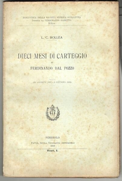 In 8°, pp. VIII, 127. Brossura editoriale. Fioriture alla copertina, per il resto copia in buono stato, interamente a fogli chiusi. Biblioteca della Società Storica Subalpina, XIX. II.
