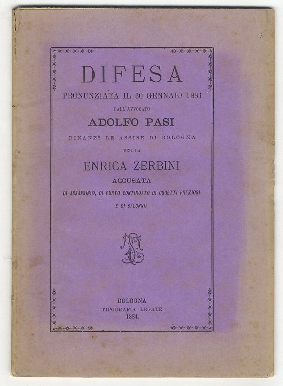 Bologna, Tipografia Legale, 1884, in-8, brossura editoriale viola con cornici tipografiche, pp. 87, [1]. “Questa difesa è stata stenograficamente raccolta alla udienza e data alle stampe per cura degli amici”. Si tratta di uno dei tanti interventi difensivi durante il lungo e seguitissimo processo alla domestica Enrica Zerbini, accusata dell'omicidio del facoltoso orefice Luigi Camillo Coltelli, che dopo più di due mesi di processo e scoop, si concluse con l'assoluzione dell'imputata. Molto raro. Condizioni molto buone.