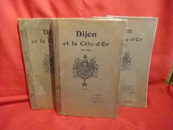 Dijon, Comité local de l'Association française pour l'Avancement des Sciences, 1911; grand in-8 (168 x 254 mm), 8-580 pp., 4-466 pp., 2-VI-6-436 pp. + 31 pl., dont 4 dépliantes hors-texte, broché. 40ème congrès de l'Association française pour l'Avancement des Sciences. Dédicace du Dr Michaut, professeur à l'École de médecine et de pharmacie de Dijon, secrétaire du Bureau du Comité local de l'Association française pour l'Avancement des Sciences, à M. le professeur Muller. Sommaire : - Tome I : Stephen Liégeard : Ode à la Bourgogne ; A. Mairey : les Régions naturelles de la Côte-d'Or ; H. Hauser : le Site et la Croissance de Dijon ; L. Collot : Esquisse géologique de la Côte-d'Or ; G. Curtel et C. Drioton : Gouffres et Cavernes de la Côte-d'Or ; J. Roux : le Climat de Dijon et de la Côte-d'Or ; J. d'Arbaumont : la Flore de la Côte-d'Or ; M. Barbier : la Vulgarisation des Connaissances pratiques sur les Champignons ; P. Paris : la Faune de la Côte-d'Or ; J. Guicherd : l'Agriculture de la Côte-d'Or ; J. Guicherd et L. Laprugne : le Bétail de la Côte-d'Or ; J. Vercier : l'Arboriculture et l'Horticulture dans la Côte-d'Or ; L.-A. FABRE : les Territoires sylvo-pastoraux du département de la Côte-d'Or ; J. Guicherd : les Vignobles de la Haute-Bourgogne ; G. Curtel : la Vinification en Bourgogne ; L. Mathieu : Caractères et Classification des Vins de Bourgogne ; L. Mathieu : l'Art de consommer les Vins de Bourgogne ; G. Martin : le Commerce de la Côte-d'Or ; A. Berthiot : l'Industrie de la Côte-d'Or ; C. Boulanger : l'Industrie électrique en Bourgogne. - Tome II : J. Calmette et H. Drouot : Aperçu du passé historique et artistique de la Bourgogne ; H. Chabeuf : la Côte-d'Or monumentale ; H. Chabeuf : le Musée de Dijon ; C. Drioton et A. Moingeon : les Temps préhistoriques et protohistoriques dans la Côte-d'Or ; J. Toutain : Alesia - les Fouilles de la Société des sciences de Semur ; Ct Esperandieu et Dr Épery : Alesia - les Fouilles de la Croix-Saint-Charles ; H. Lorimy : Vertillum - les Fouilles de la Société archéologique et historique du Châtillonais ; C. Drioton : le Castrum Divionense ; abbé Voillery : Beaune historique et archéologique ; F. Claudon : les Archives de la Côte-d'Or ; C. Oursel : la Bibliothèque publique de Dijon ; C. Oursel : les Archives municipales. - Tome III : F. Galliot : les Voies de communication de la Côte-d'Or ; L. Eisenmann : Dijon centre de communication ; J. Legras : le Tourisme en Bourgogne ; de Geoffroy : la Manufacture des Tabacs de Dijon ; E. Rogez : la Poudrerie nationale de Vonges (Côte-d'Or) ; les Collections d'Histoire naturelle ; les Sociétés savantes ; J. Guicherd : les Associations agricoles ; A. Hurion : les Savants bourguignons ; l'Enseignement supérieur en Bourgogne - l'Université de Dijon ; l'Enseignement secondaire et primaire - l'Enseignement professionnel ; l'Enseignement des Beaux-Arts à Dijon ; Démographie - Assistance publique - Hospitalisation - Protection de l'enfance ; l'Assistance privée à Dijon - la Mutualité dans le département - les Groupements parisiens des originaires de la Côte-d'Or ; G. Zipfel : l'Hygiène à Dijon ; A. Carreau : Hygiène de l'alimentation ; G. Curtel : les Eaux de Dijon. Très nombreuses illustrations en noir et blanc (284 in texte et 31 hors-texte).