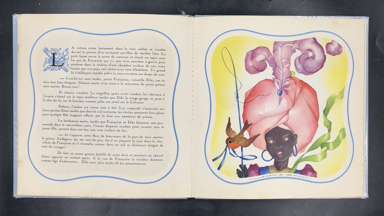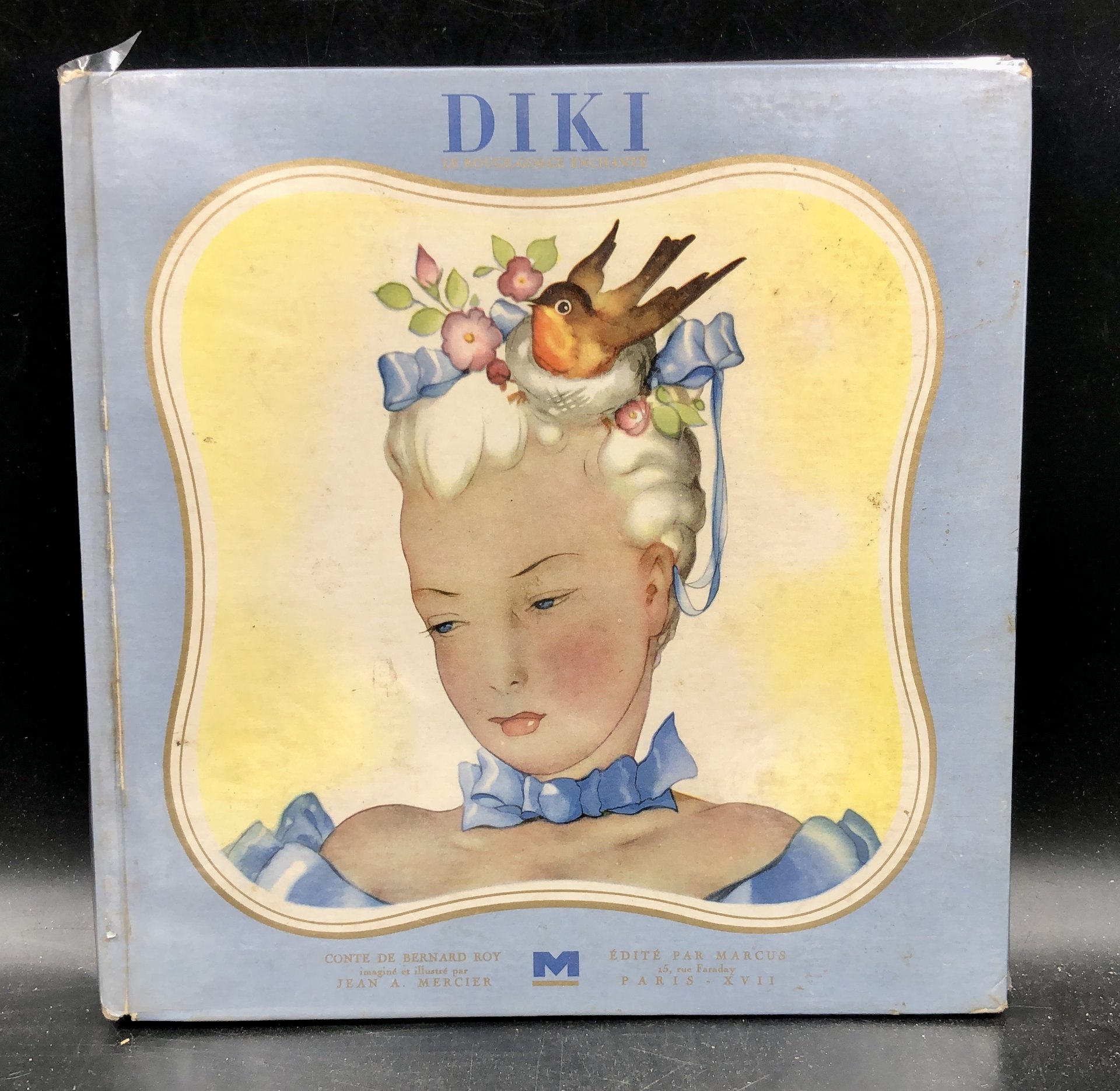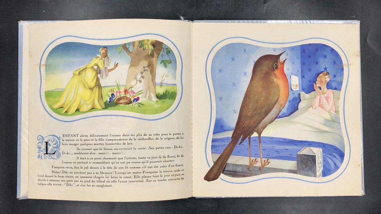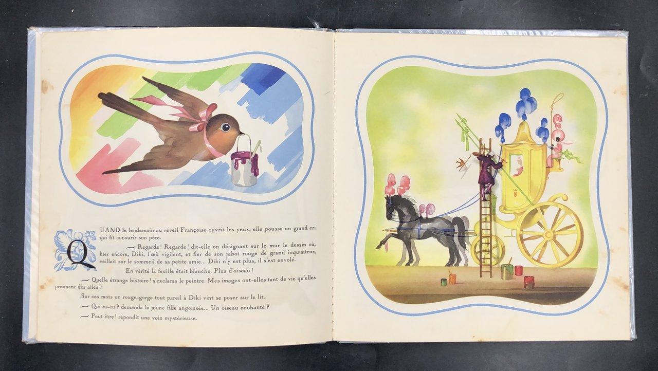In-8° quadrotto (cm. 25,5x24,9), pp. 22 non numerate. Cartoncino ed. ill. a col. (strappetti al ds.). Con 18 superbe ILLUSTRAZIONI (tra cui 8 TAVOLE a piena pag.) a insoliti allegrissimi colori di Jean Adrien MERCIER (Angers 1899-1995) cartellonista di cinema, poi per affiches pubblicitari Cointreau, e per la sala-giochi infanzia del piroscafo "France" e i menù per la French Line; un lotto di suoi manifesti e acquerelli fu acquisito dallo Stato franc. Disegnò questi racconti per la figlioletta Sylvie. Storia fantastica mirabolante e gentile di un pettirosso. Stupendo per l'innovante vivacità e raffinatezza delle figure.