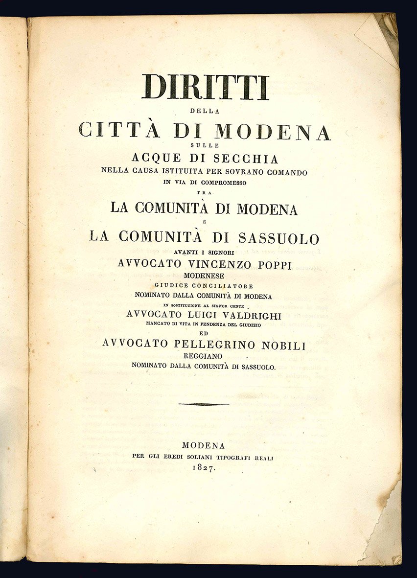 Diritti della città di Modena sulle acque di Secchia nella causa istituita per sovrano comando in via di compromesso tra la comunità di Modena e la comunità di Sassuolo avanti i signori Avvocato Vincenzo Poppi modenese giudice conciliatore nominato dalla comunità di Modena in sostituzione al signor conte Avvocato Luigi Valdrighi mancato di vita in pendenza del giudizio ed Avvocato Pellegrino Nobili reggiano nominato dalla comunità di Sassuolo.