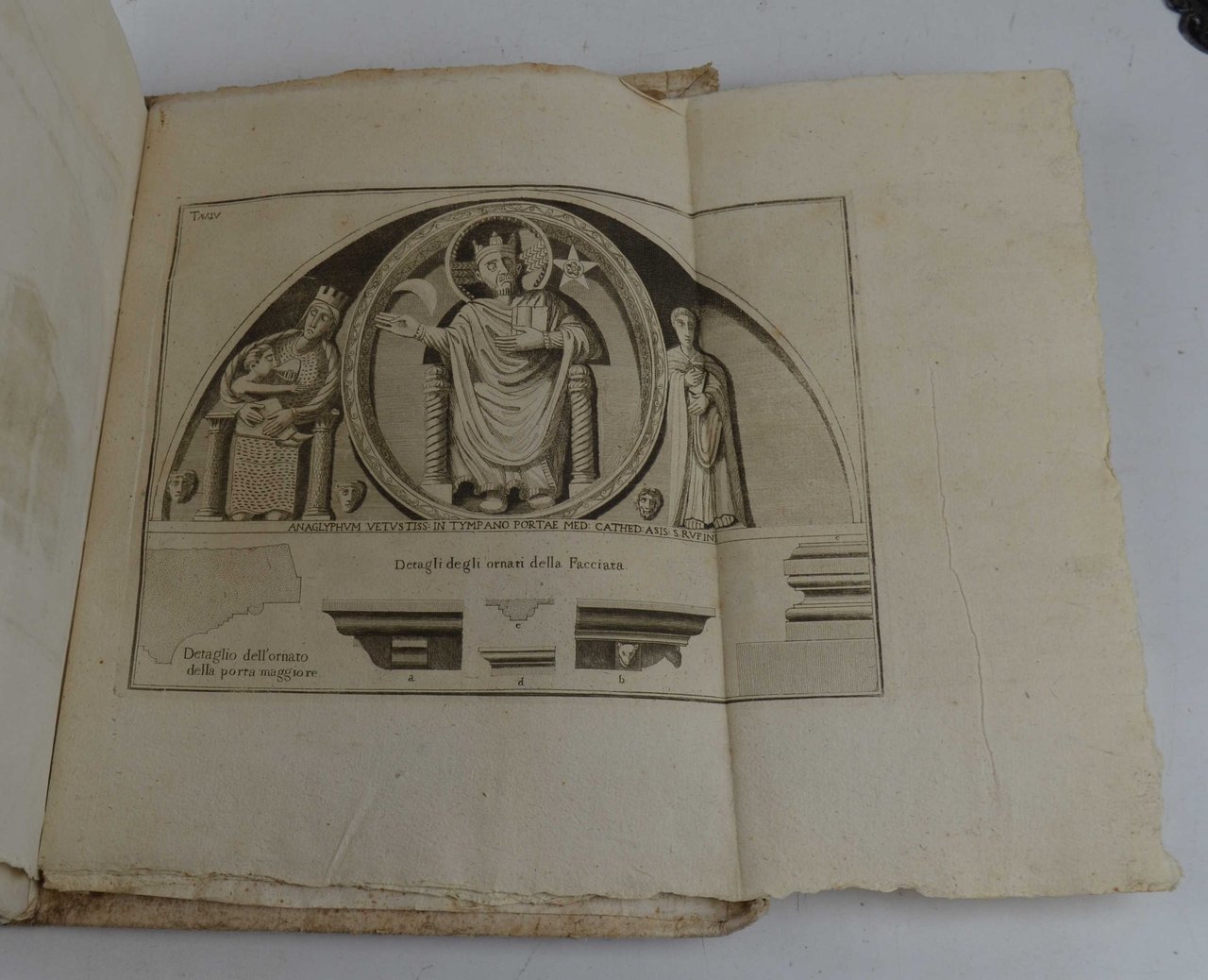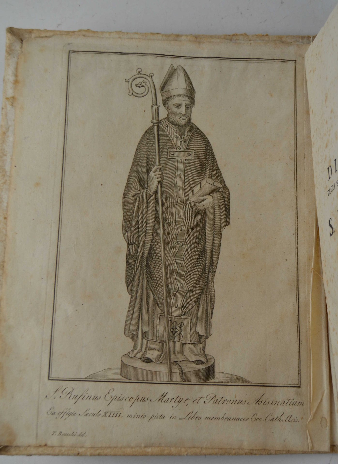 Cm. 30, pp. xxiii (1) 542. Antiporta incisa in rame con la raffigurazione del santo e 10 tavole f.t. (anche ripiegate) raffiguranti tra l'altro la pianta e lo spaccato della chiesa di S. Rufino. Legatura coeva in cart. alla rustica con nervi passanti. Qualche fioritura alle prime carte, leggermente slegato, peraltro esemplare genuno e marginoso (in barbe). Cfr. Melzi (I, 307); Lozzi (I, 225): "L'opera è davvero assai importante e molto ricercata".