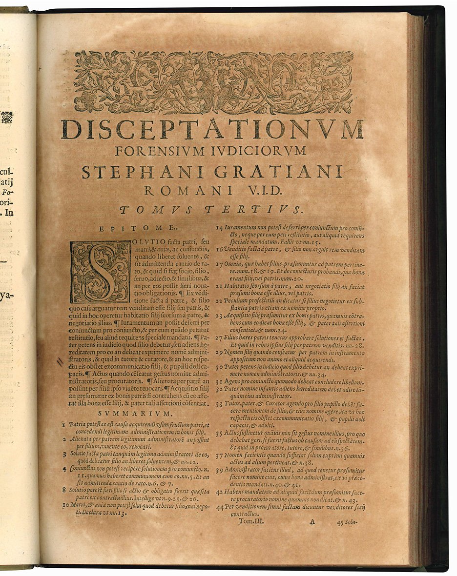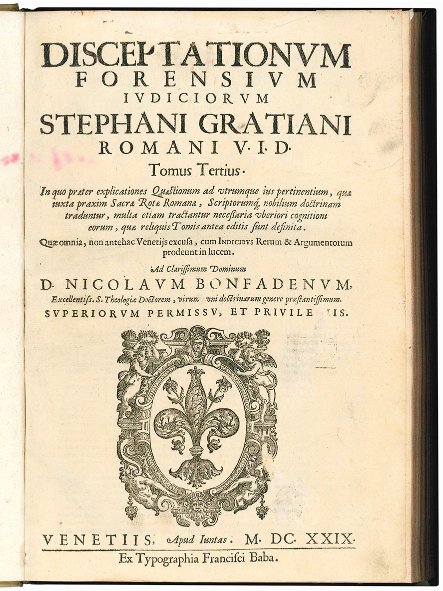 Disceptationum forensium iudiciorum Stephani Gratiani romani V. I. D. Tomus tertius. In quo praeter explicationes quaestionum ad utrumque ius pertinentium, quae iuxta praxim Sacrae Rotae Romanae, Scriptorumq nobilium doctrinam traduntur, multa etiam tractantur necessaria uberiori cognitioni eorum, quae reliquis Tomis antea editis sunt definita. Quae omnia, non antehac Venetijs excusa, cum indicibus rerum & argumentorum prodeunt in lucem [...]