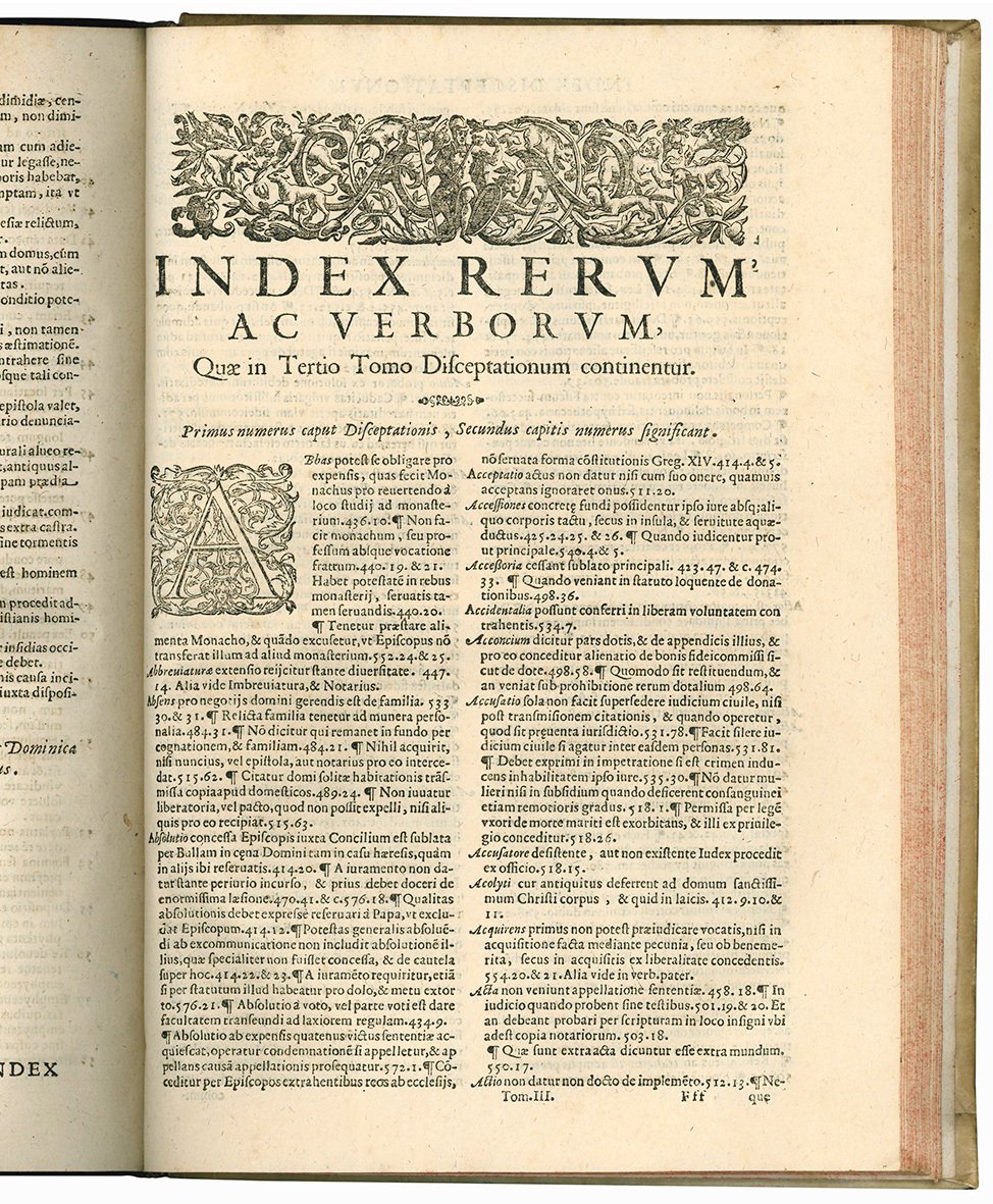Un volume di cinque in folio (mm 312x210); pp. [36], 612, [88]. Segnatura: a-c6 A-Lll6 Mmm8. Marca editoriale xilografica al frontespizio. Frontalini ed iniziali xilografiche. Testo stampato su due colonne. Piccola mancanza al margine superiore e restauro al frontespizio. Alcune carte pesantemente brunite, segni di tarlo al margine interno bianco di alcune carte. Piena pergamena coeva con titolo in oro su tassello al dorso. Tagli spruzzati in rosso. Lievissimi aloni ai piatti dorso un po' sporco.