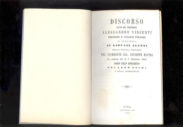 IN 8°, pp.19, COPERTINA IN BROSSURA MUTA. DISCORSO LETTO DAL SACERDOTE ALESSANDRO VINCENTI PROPOSTO E VICARIO FORANEO DI SERAVEZZA AI GIOVANI ALUNNI<BR>DELLA SCUOLA PRIVATA DEL SACERDOTE SIG. GIUSEPPE MATTEI LA MATTINA DEL DI' 7<BR>SETTEMBRE 1862 GIORNO DELLO ESPERIMENTO NEI LORO STUDI E DELLA PREMIAZIONE.<BR>OTTIMA CONSERVAZIONE. ID 2548