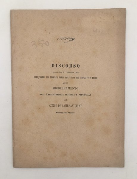 In-8° (cm. 22.2), pp. 38. Brossura editoriale. Il conte Luigi Guglielmo conte di CAMBRAY-DIGNY (Firenze, 8 aprile 1820 - San Piero a Sieve 1906), liberale moderato, senatore, Ministro dell'Agricoltura, Industria e Commercio e poi delle Finanze durante il periodo in cui Firenze era capitale del regno d'Italia, Sindaco dal primo gennaio 1865 al 27 ottobre 1867. Censito in 6 bibl.