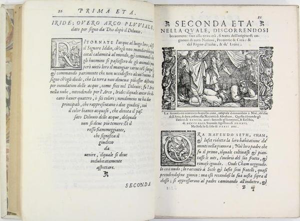 Gabriel Giolito di Ferrarii, Vinetia [Venise], 1574. Grand In-8, reliure en cartonnage du dix-neuvième siècle, plats en velin blanc encadrés d’un filet noir et orné de 5 fleurons dorés, dos lisse orné, pièce de titre en basane brune. 4 ff. n. ch., 231 pages, 32 ff. n. ch. Très belle impression vénitienne orné de grandes lettrines historiées. En romaines et italiques, chaque fin de partie formant un triangle typographique. Mors fendus, un coin légèrement abîmé. Bel état de fraîcheur des feuillets. Édition originale illustrée de 30 bois, certains formant des emblèmes.