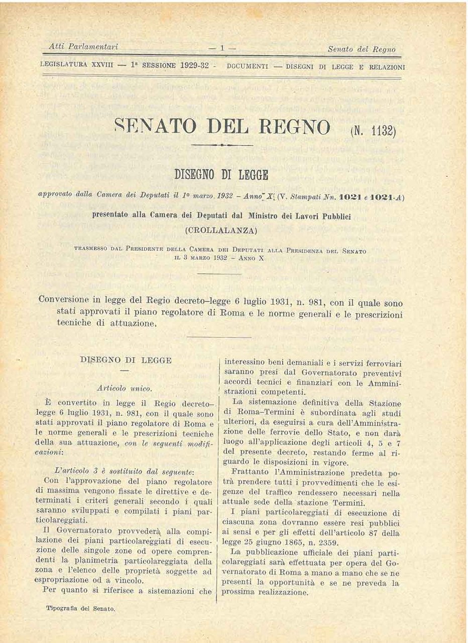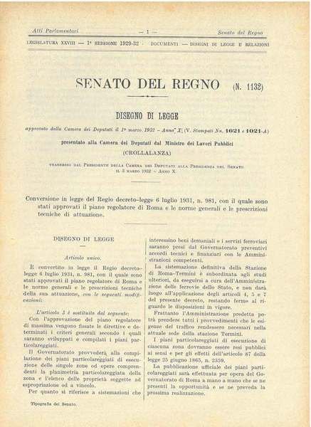 Disegno di legge: Conversione in legge del Regio decreto-legge 6 luglio 1931, n. 981, con il quale sono stati approvati il piano regolatore di Roma e le norme generali e le prescrizioni tecniche di attuazione