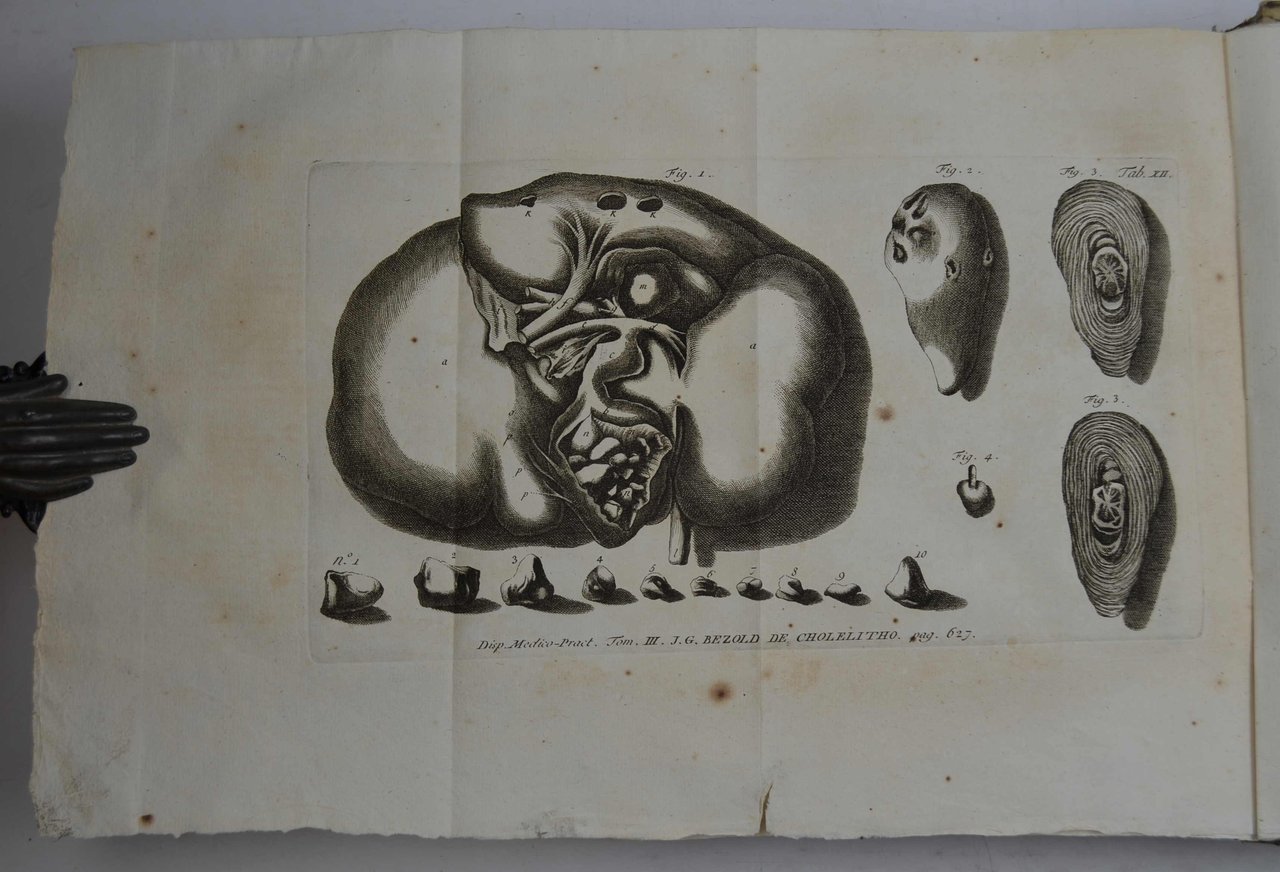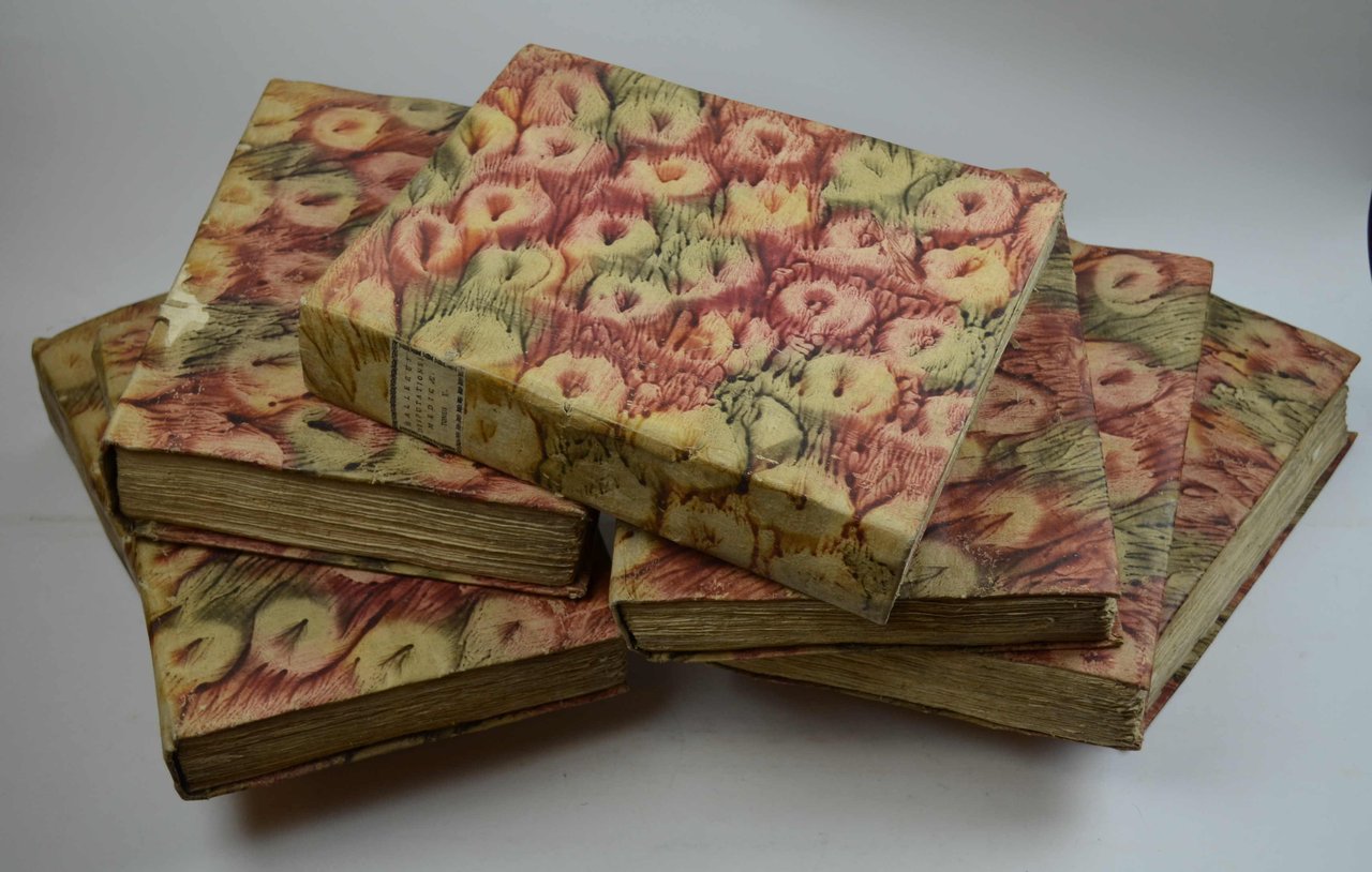 Otto volumi di cm. 28, pp. oltre 4.000 complessive. Frontespizi in rosso e nero con vignette centrali e 34 tavole f.t. incise in rame di cui 20 ripiegate. Bella legatura strettamente coeva in cart. alla rustica ricoperto in carta decorata. Tasselli in carta con titoli a stampa ai dorsi. Qualche sezione di carte naturalmente brunita, peraltro esemplare assai genuino e marginoso (in barbe). Edizione originale di questa raccolta di opera impreziosita da una legatura assai decorativa. Cfr. Wellcome (III, 199) e Hirsch (III, 33-35).