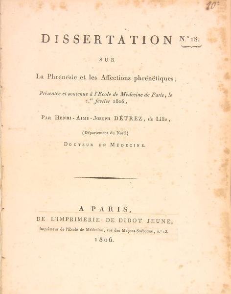 Paris, imprimerie Didot Jeune, 1806. un cahier de 16 pages. - 25 x 19.5 cm. Quelques rousseurs. Dissertation soutenue à l’école de Médecine de Paris, le 1er février 1806.