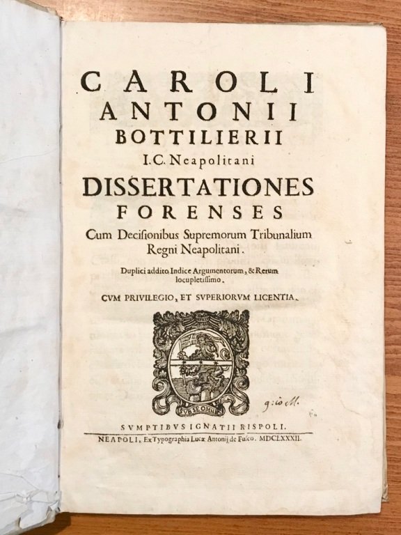 <span style="font-style: normal;">In-folio (cm. 31,7), legatura coeva in piena pergamena, titolo anticamente ms. al taglio inferiore, pp. [8] 220 [22] in buono stato, stemma silografico al frontespizio (leone rampante che tiene un vessillo), testatine e capilettera sempre in legno, testo su due colonne; bruniture e lieve alone al solo margine laterale in fine. Edizione originale che tratta di diritto successorio; l'opera principale del Bottiglieri titolava </span><i>De successionibus</i> (Napoli 1653). Buon esemplare.
