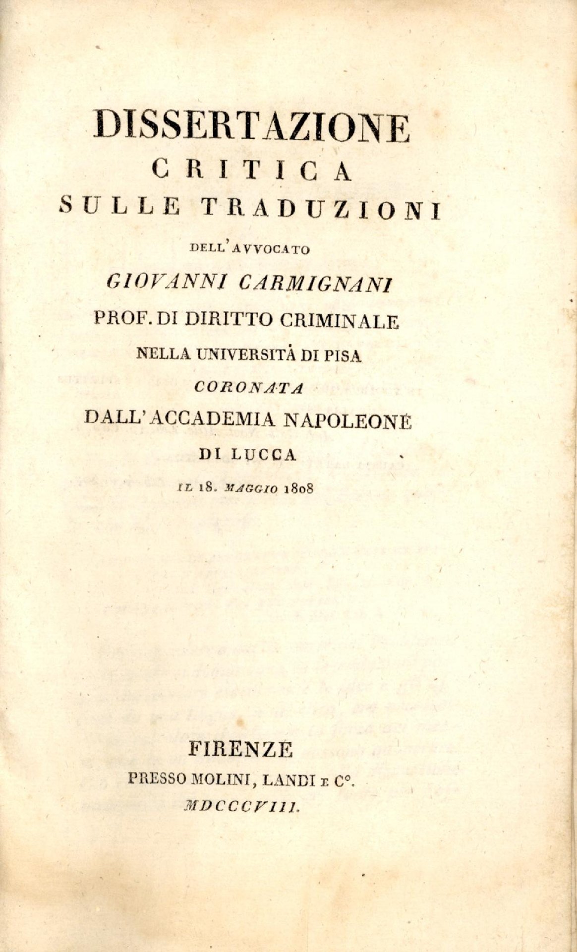 ...dell'avvocato Giovanni Carmignani ... coronata dall'Accademia Napoleone di Lucca il 18 maggio 1808. 116 pp. Evidenti segni d'uso alla copertina, interno in buone condizioni. 801 - Ba Buono (Good)