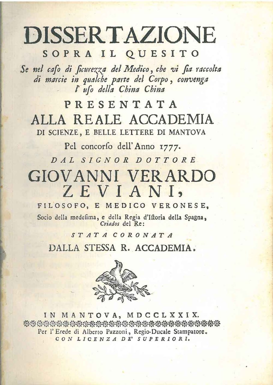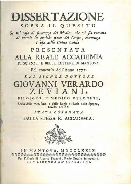 Dissertazione sopra il quesito se nel caso di sicurezza del medico, che vi sia raccolta di marcie in qualche parte del corpo, convenga l'uso della china china presentata alla reale accademia di Scienze, e belle lettere di Mantova pel concorso dell'anno 17