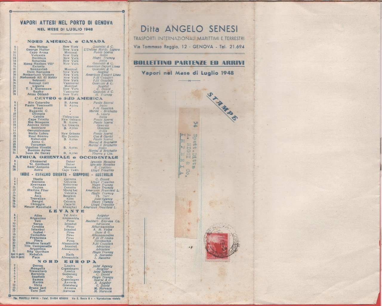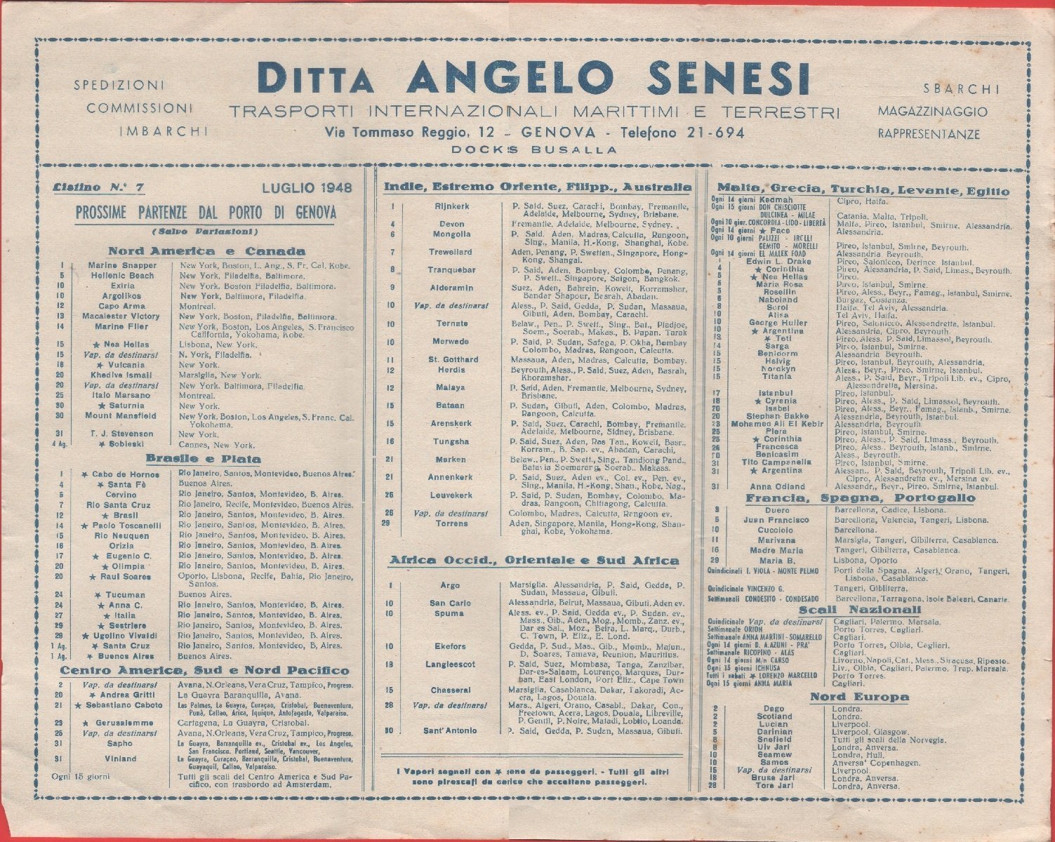Ditta Angelo Senesi. Bollettino partenze e arrivi porto di Genova, luglio 1948