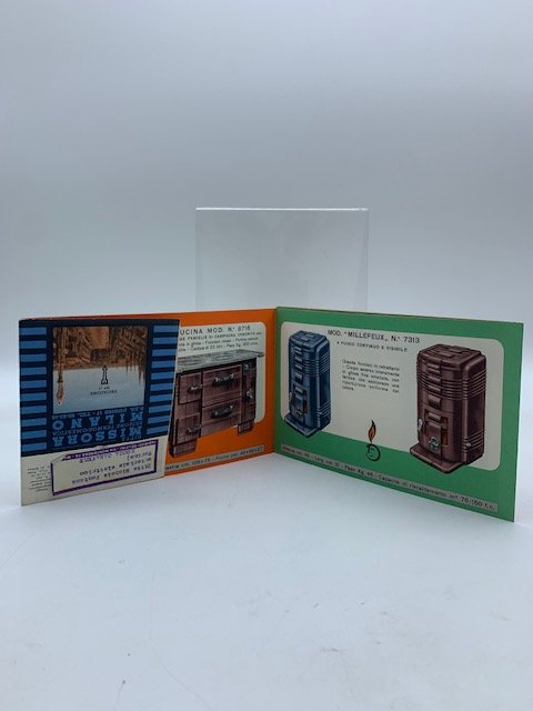 Pieghevole pubblicitario illustrato a colori (aperto misura cm 66,5 x 24) con 25 illustrazioni al recto e al verso del foglio raffiguranti modelli di stufe in ghisa smaltata prodotte dalla ditta Deville rappresentata dalla Ditta Missora di Milano. Etichetta con indirizzo di spedizione applicata al foglio.