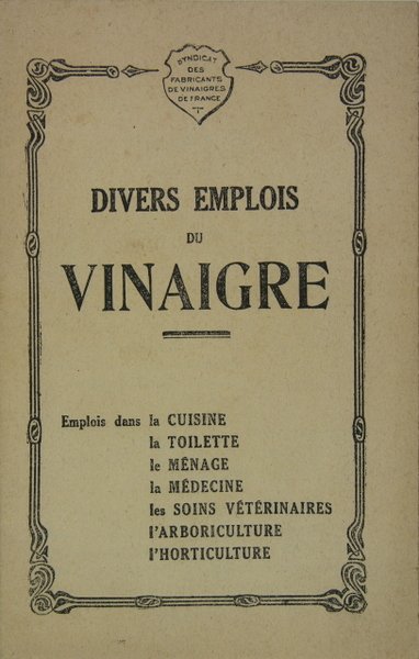 Syndicat des fabricants de vinaigres de France, s.d. (années 30). Plaquette in/12 couverture imprimée, 28 p. Le vinaigre est indispensable : on l’emploi tant dans la cuisine, que pour la toilette, le ménage, la médecine, les soins vétérinaires, l’arboriculture, l’horticulture.