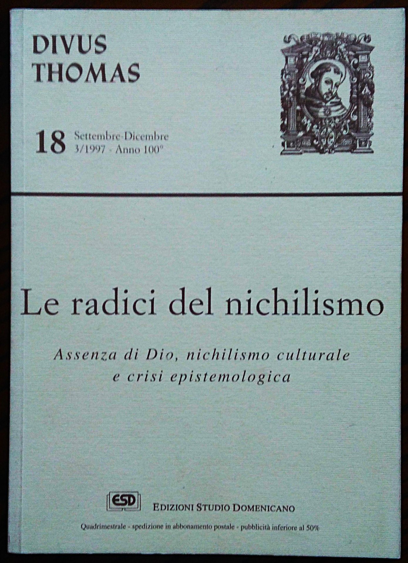 Divus Thomas. Rivista quadrimestrale dello Studio Filosofico Domenicano. N. 18, Settembre-Dicembre 1997. Le radici del nichilismo. Assenza di Dio, nichilismo culturale e crisi epistemologica. Atti del Convegno Modena, 22 marzo 1997. A cura di P. Giuseppe Barzaghi ed Emanuele Morandi.