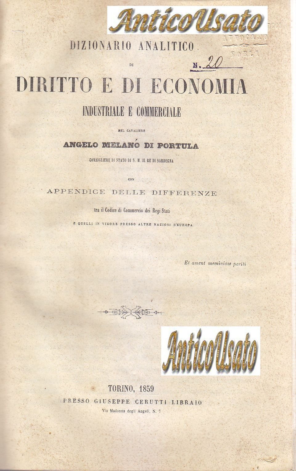 DIZIONARIO ANALITICO DIRITTO ECONOMIA INDUSTRIALE di Melano Portula 1859 Libro