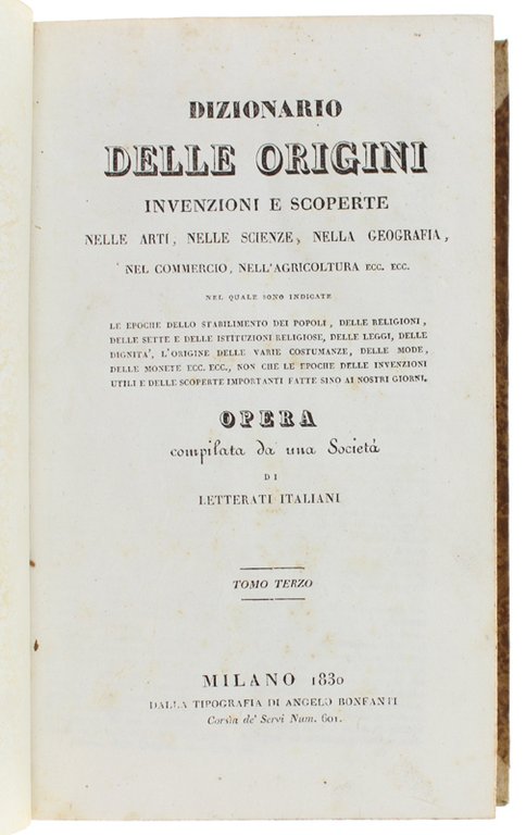 DIZIONARIO DELLE ORIGINI, Invenzioni e Scoperte nelle Arti, nelle Scienze, nella Geografia, nel Commercio, nell'Agricoltura, ecc. ecc.