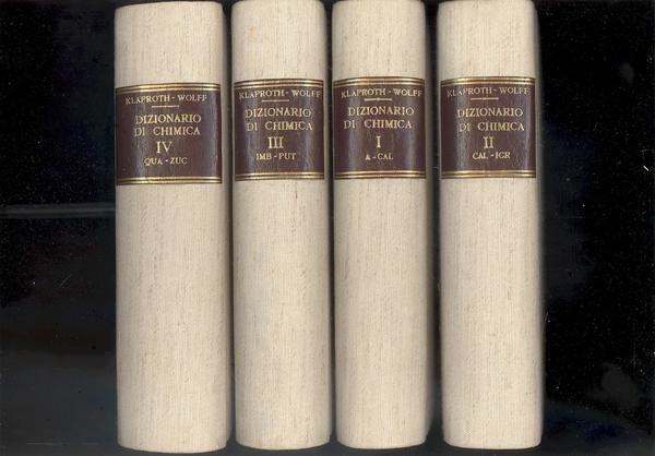 OPERA IN 4 VOLL. IN 8°.VOL.I,A-CAL,pp.XII+463+IV TAV.f.t.+1 BELLA INC.IN TONDOALL'INIZIO<BR>RAFFIG. MARTINO ENRICO KLAPROTH DI G.DALL,ACQUA.VOL.II,CAL-IGR,pp.505.VOL.III,IMB-PUT,<BR>pp.454+4 TAV.f.t.IV VOL.QUA-ZUC,pp.559.LEGATURE IN TUTTA TELA RIGIDE CONTEMP. CON<BR>TASSELLI IN PELLE E .TITOLI.BUONA CONSERVAZIONE SALVO ALCUNI ALONI AL II E III VOLL<BR>ID 367.