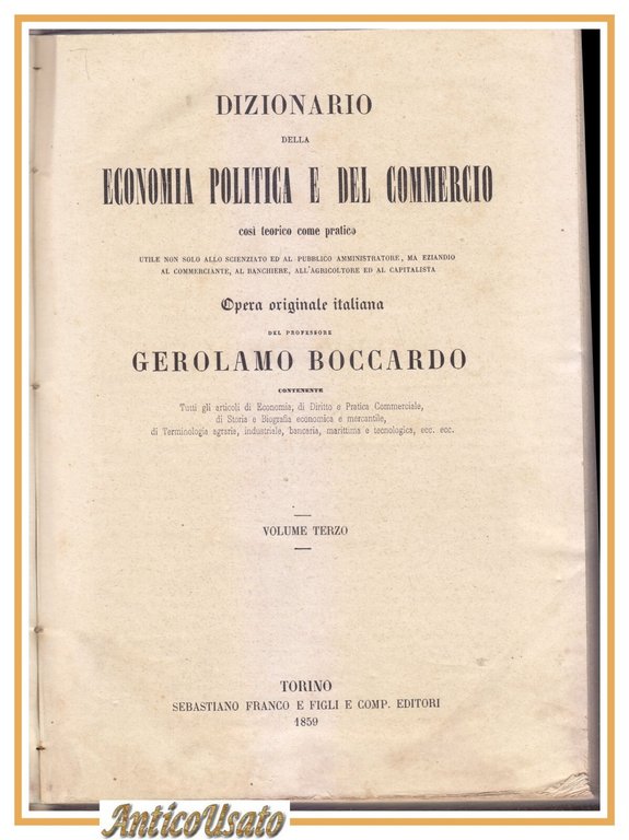 DIZIONARIO DI ECONOMIA POLITICA E DEL COMMERCIO volume 3 di Boccardo 1859 Antico